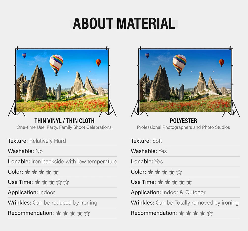 Two Materials: Vinyl(also called thin cloth) and Polyester