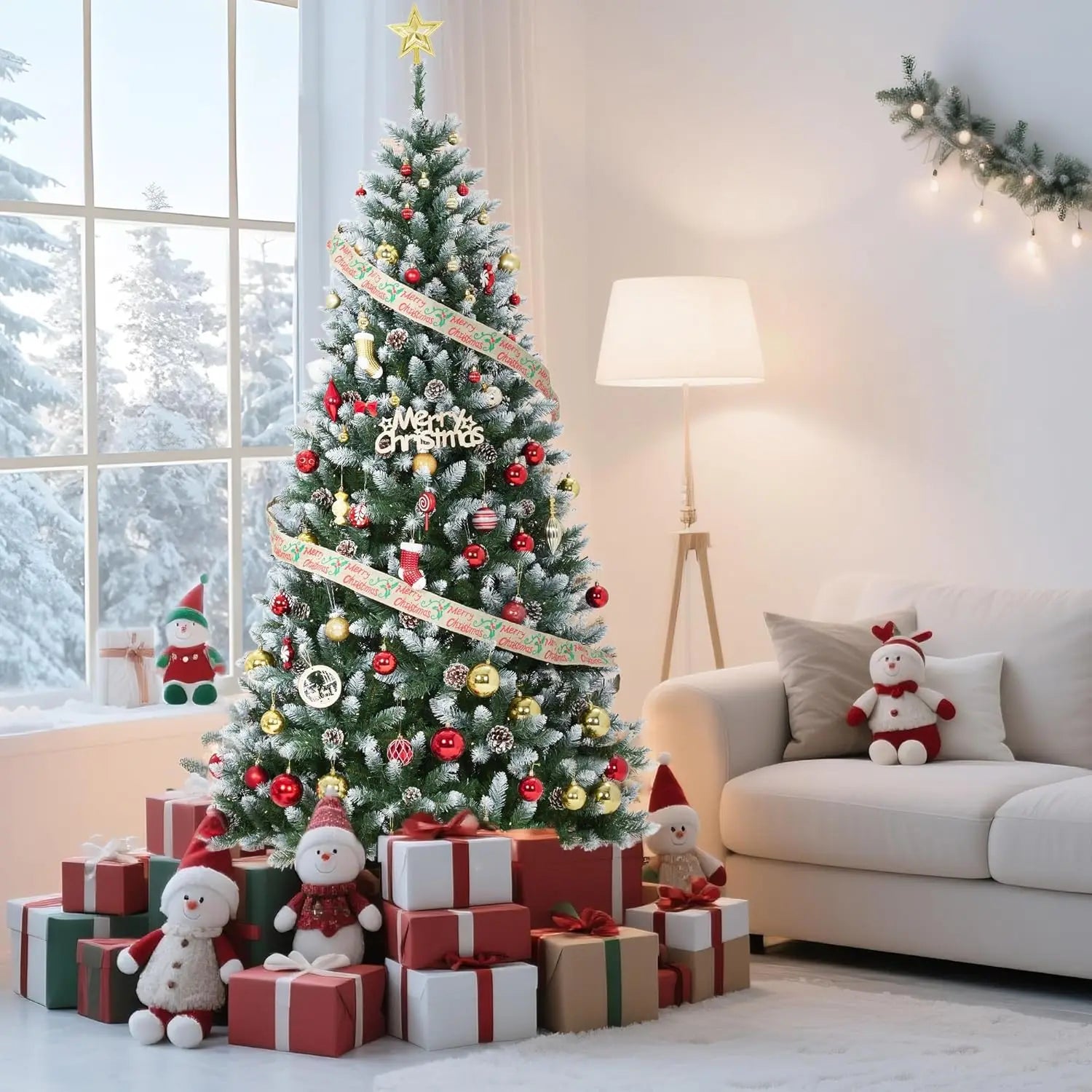 Pre-Decorated Artificial Christmas Tree Prelit 4.5FT/6FT/7.5FT/9FT Partially Flocked Design Xmas Tree with LED Lights For Home